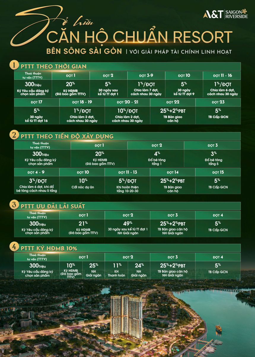 Với thiết kế tinh tế cùng đa dạng lựa chọn diện tích, A&T Saigon Riverside mang đến giải pháp sống trọn vẹn cho mọi nhu cầu: