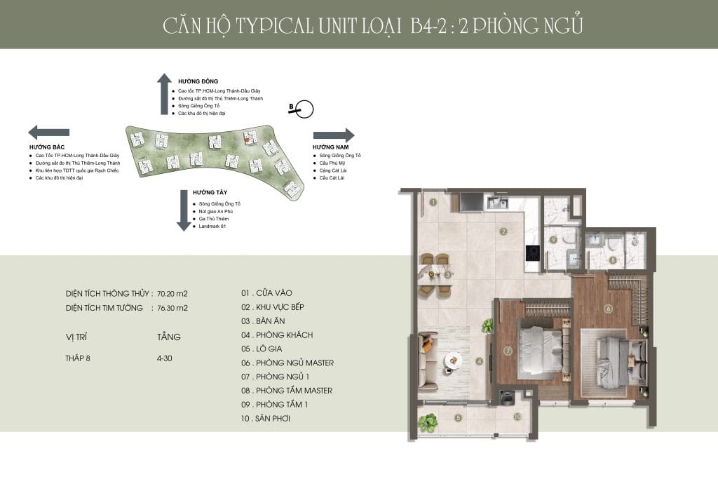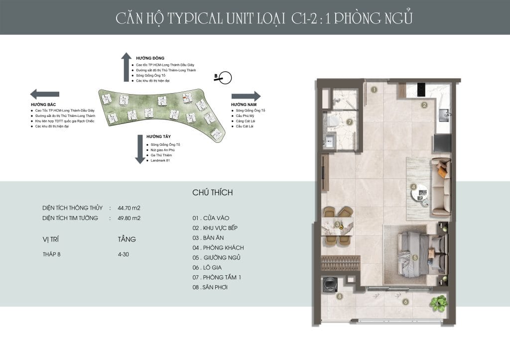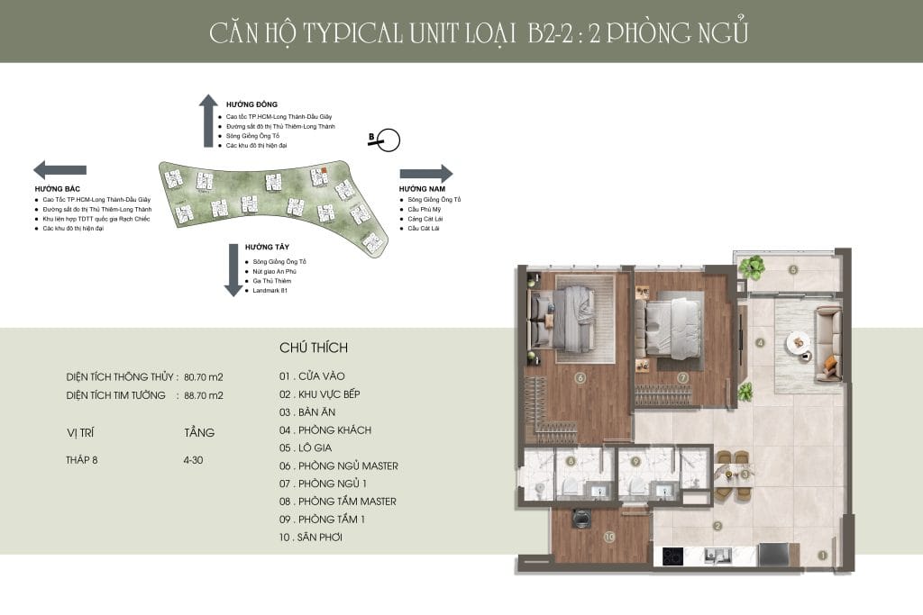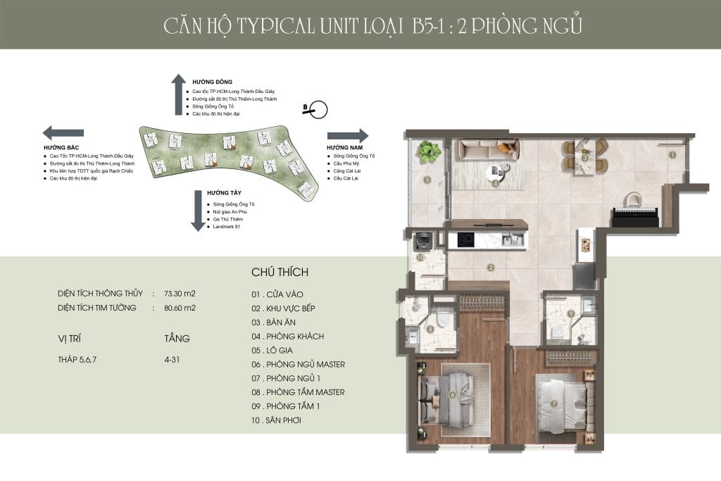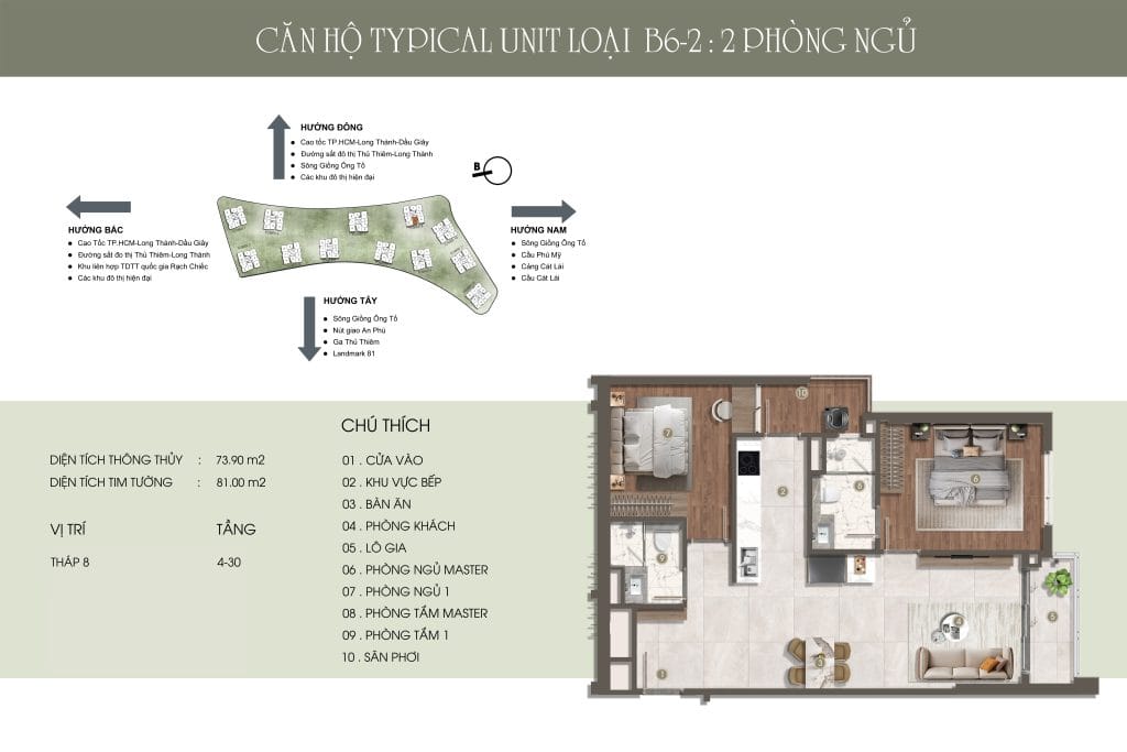 Thiết kế đẳng cấp – Không gian sống thượng lưu Căn hộ 1-3 phòng ngủ, Duplex, Penthouse với diện tích từ 49,14m² – 151,19m², bàn giao nội thất cao cấp. Mật độ chỉ 9 căn/sàn, không đối diện, đảm bảo sự riêng tư và tầm view thoáng đãng hướng sông, Thủ Thiêm, và Landmark 81.