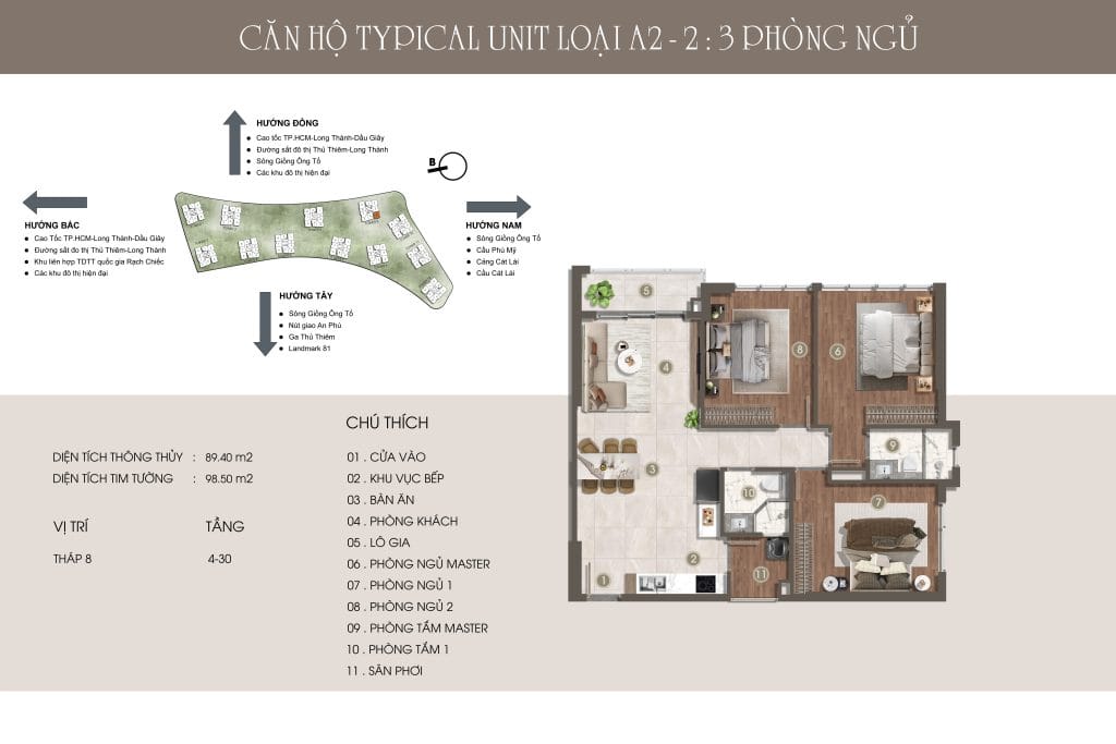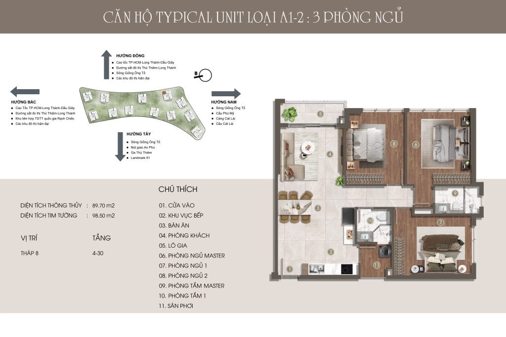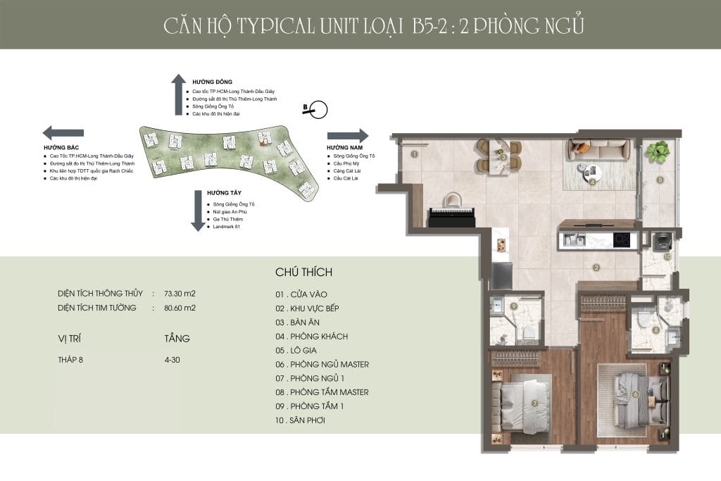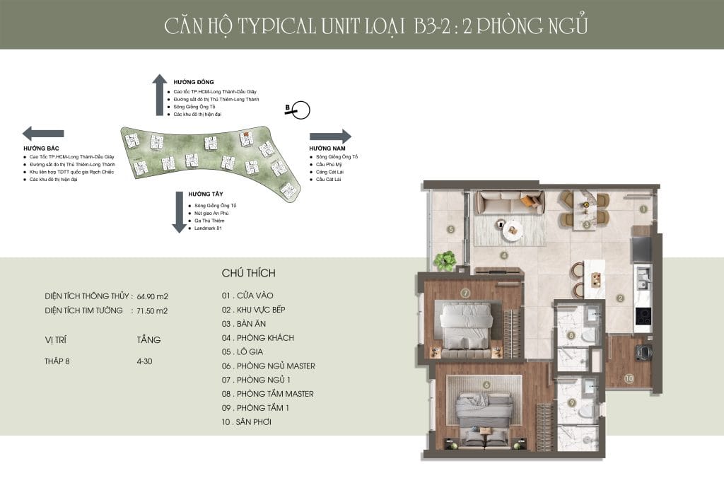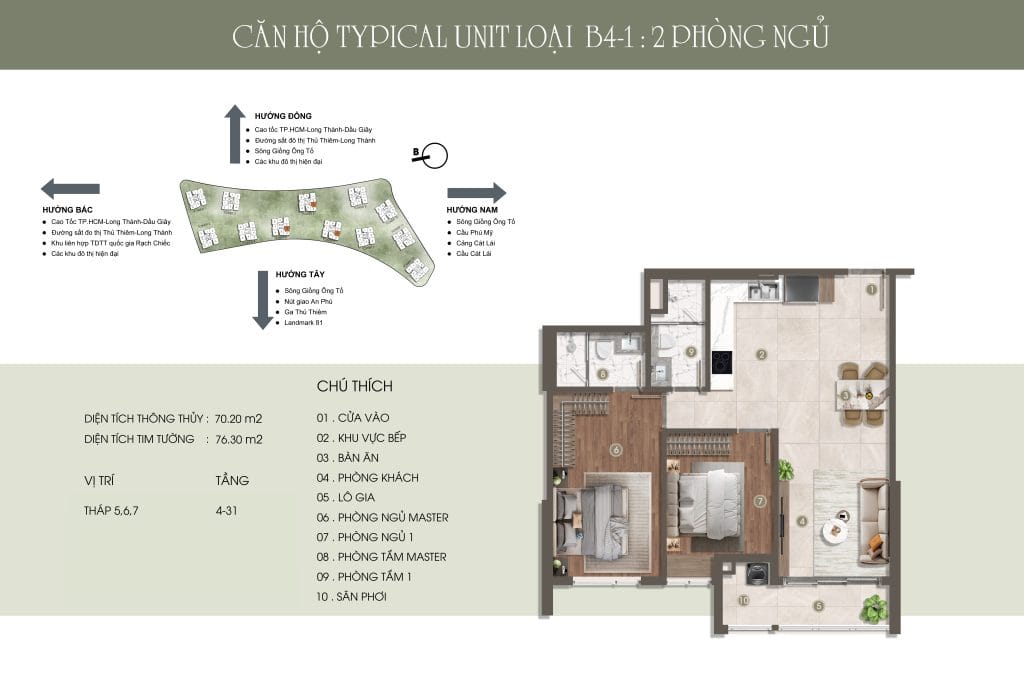 Thiết kế đẳng cấp – Không gian sống thượng lưu Căn hộ 1-3 phòng ngủ, Duplex, Penthouse với diện tích từ 49,14m² – 151,19m², bàn giao nội thất cao cấp. Mật độ chỉ 9 căn/sàn, không đối diện, đảm bảo sự riêng tư và tầm view thoáng đãng hướng sông, Thủ Thiêm, và Landmark 81.